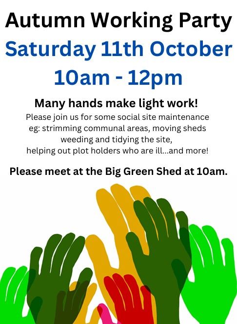 Meet at the big green shed for our seasonal tidy-up and maintenance session. It’s a great way to pitch in, meet fellow plotholders, and help keep our site thriving.